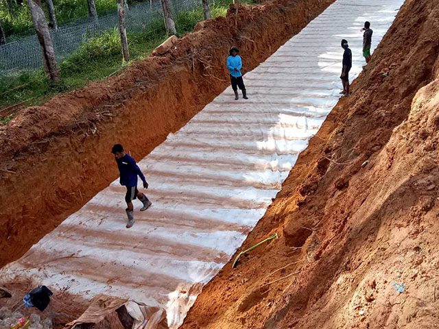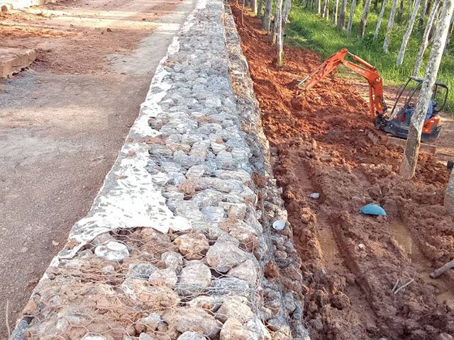 กำแพงกันดิน สำหรับงานที่ต้องการพื้นที่ถนนเพิ่มในโรงงาน ลูกค้าต้องการขยายถนนให้กว้างขึ้นจนถึงสุดเขตพื้นที่ดิน โดยใช้กล่องเกเบี้ยทำเป็นกำแพงกันดินและเติมดินพร้อมบดอัดถนนก่อนที่ชั้นบนสุดจะเทพื้นคอนกรีต